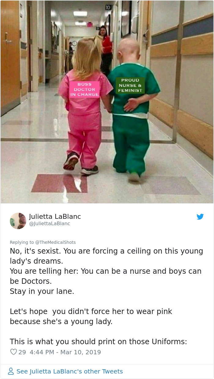 В Twitter под названием Medical Shots («Медицинские снимки») недавно появилась невинная, на первый взгляд, фотография, на которой маленькие мальчик и девочка идут по коридору госпиталя, одетые в зелёный и розовый костюмы медиков. В аккаунте снимок был опубликован с подписью: «Это очень мило, не так ли?! 😍» Однако на страницу обрушился шквал гневных комментаторов, которые посчитали снимок не милым, а оскорбительным.