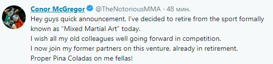 Привет, ребята, я решил уйти из спорта. Желаю всем моим старым коллегам успехов в соревнованиях. Теперь я присоединяюсь к своим бывшим партнерам, которые уже на пенсии. С меня правильная пинаколада, ребята! — написал боец.