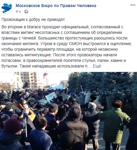 В ходе провокаций со стороны митингующих в столице Ингушетии Магасе ранения получили 10 сотрудников полиции, двое из них находятся в тяжелом состоянии, сообщило в Facebook Московское бюро по правам человека.