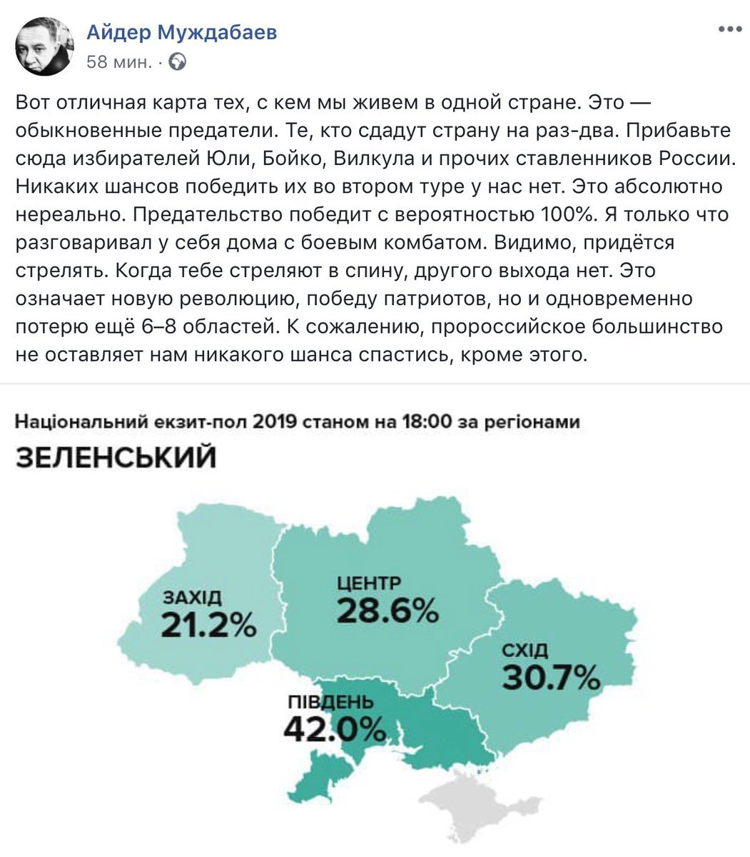 При этом в рядах сторонников Порошенко на Украине после первого тура позитива поубавилось. Например, симпатизирующий президенту замдиректора телеканала ATR крымско-татарский журналист Айдер Муждабаев назвал всех, кто не проголосовал за Порошенко, «предателями».