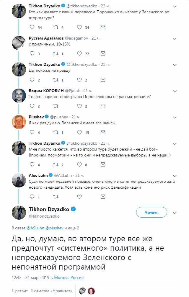 «Если же второй тур пройдет в нынешней конфигурации, то голоса Тимошенко и Бойко, скорее всего, будут консолидированы в пользу Зеленского. Однако нельзя однозначно утверждать, что Зеленский удобен Москве — учитывая весьма ограниченный политический опыт, он будет слишком зависим от своих спонсоров», — уверен Чихарев.