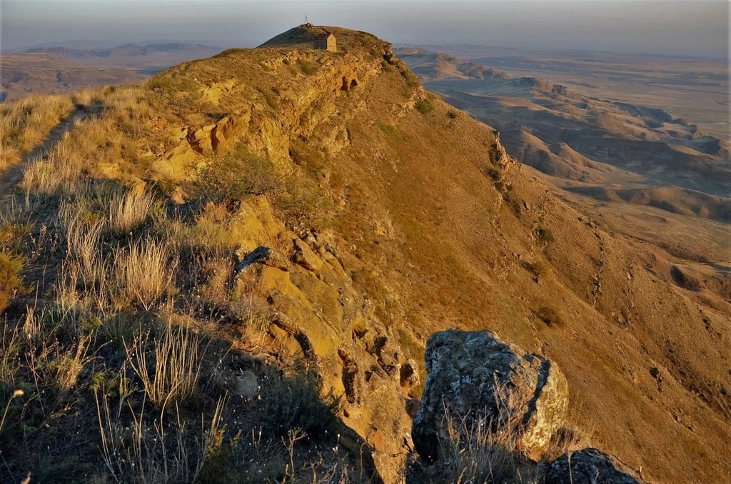 Сразу за часовней. Это маркер высоты, он же выполняет роль пограничного столба между Грузией и Азербайджаном, а тропинка, на которой я стою, — по сути, патрульная тропинка для пограничников. Справедливости ради, власти двух стран договорились, что место будет демилитаризовано и здесь будут свободно перемещаться монахи и туристы. Сейчас Баку эти договоренности нарушил и вот прямо здесь, на этой тропинке и возле часовни выставил своих военных. То есть сейчас вы туда не пройдете.
