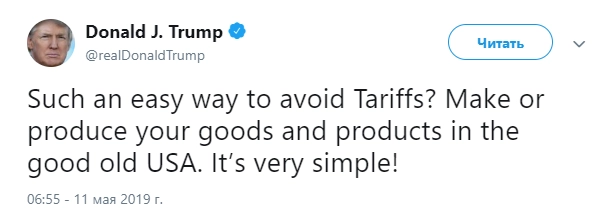 «Производите свои товары и продукты в старых добрых Штатах. Это очень просто!», — написал глава Белого дома в своем Twitter.