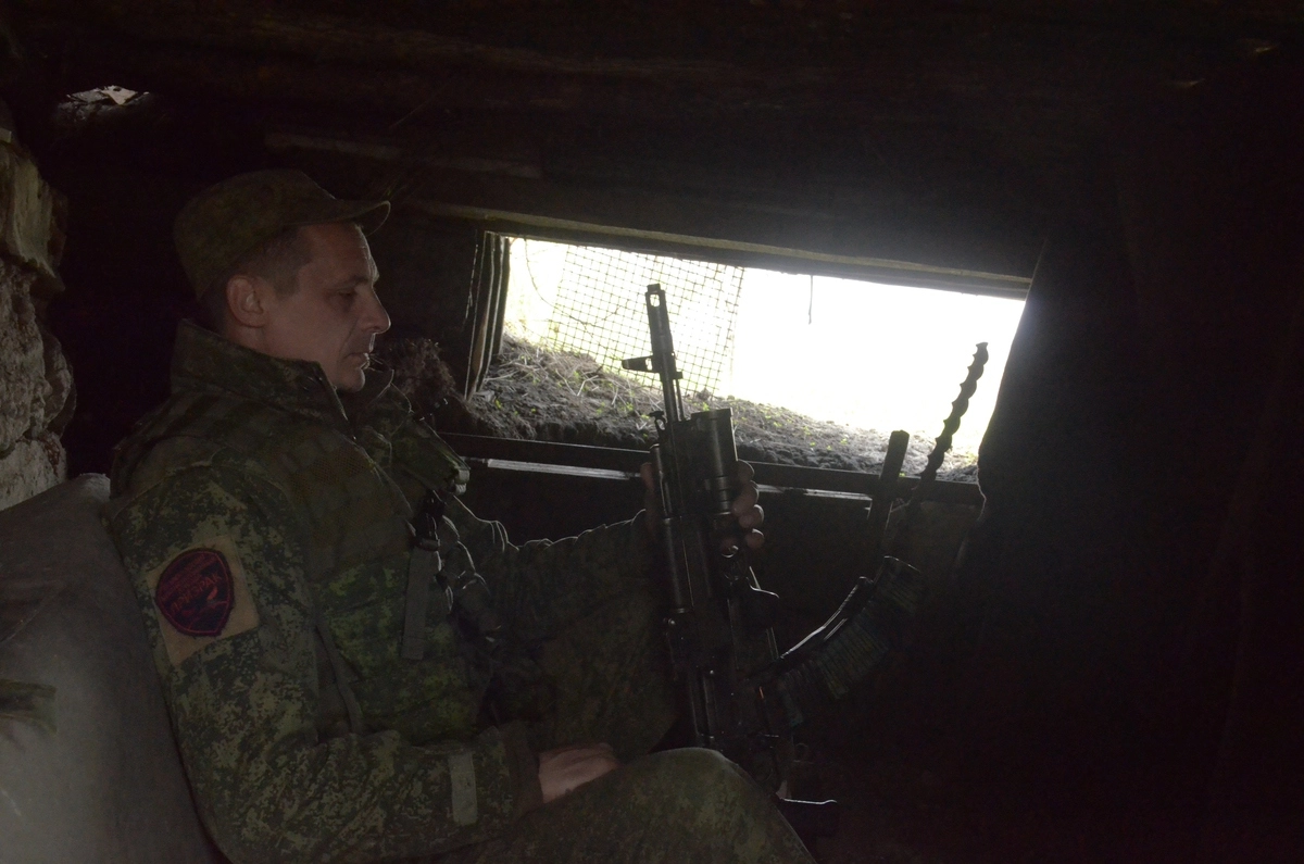 Роман, я так поняла, — командир этой позиции. Форма пиксельная, чистая, как положено. Нашивка «Богатырь» — это позывной. Лицо голливудское совершенно, положительный киногерой как есть: загорелое, прямой нос, волевой подбородок — ну правда, хоть сегодня на съемочную площадку; только видно, что не пойдет. Есть в нем местная какая-то шахтерская неторопливость, основательность, несуетность, отсекающая лишнее.