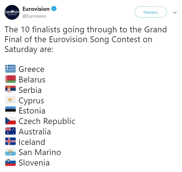 В финал «Евровидения-2019» по итогам первого полуфинала прошли представители Греции, Белоруссии, Сербии, Кипра, Эстонии, Чехии, Австралии, Исландии, Сан-Марино и Словении, сообщается на странице конкурса в Twitter.