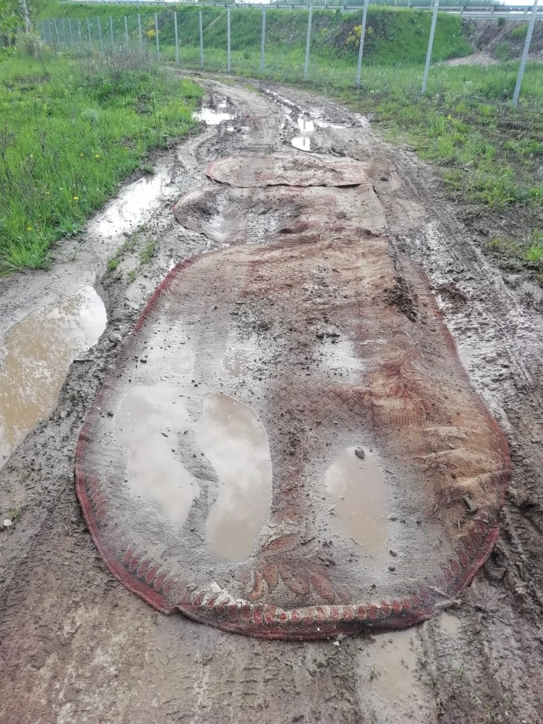 Фотографии такого суррогатного ремонта опубликовало интернет-сообщество «Интересные места Калужской области». По состоянию ковров заметно, что автомобилисты активно пользуются новым «покрытием».