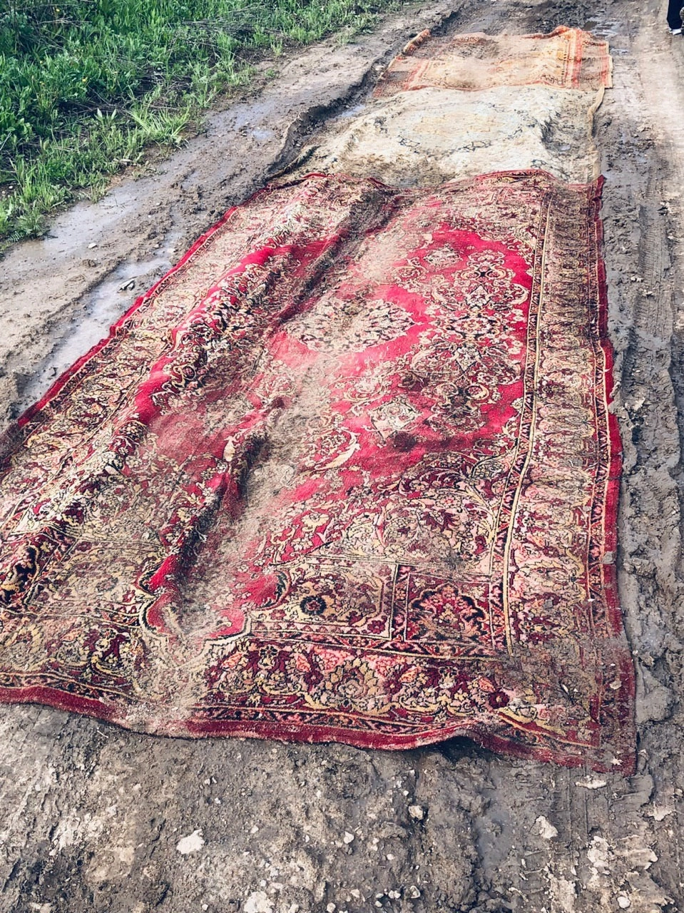 Жители Калужской области застелили одну из наиболее ухабистых и неровных проселочных дорог региона коврами.