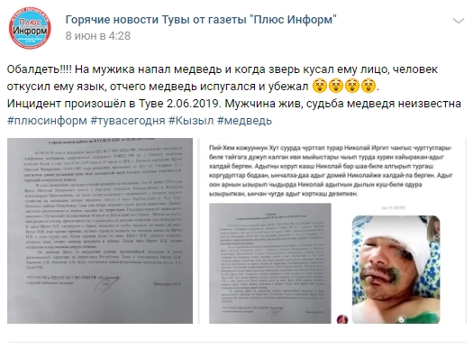 Согласно протоколу полиции, который опубликовала газета «Плюс Информ», 1 июня 29-летний Николай Иргит с двумя знакомыми отправился в тайгу, чтобы собрать опавшие сухие рога животных. Они разожгли костер, приготовили еду и разошлись в разные стороны. В тайге Иргит столкнулся с медведем. Сначала мужчина стал громко кричать, пытаясь спугнуть зверя, однако это не помогло. Когда животное вцепилось в его лицо, мужчине «удалось откусить медведю язык, отчего медведь испугался и убежал».