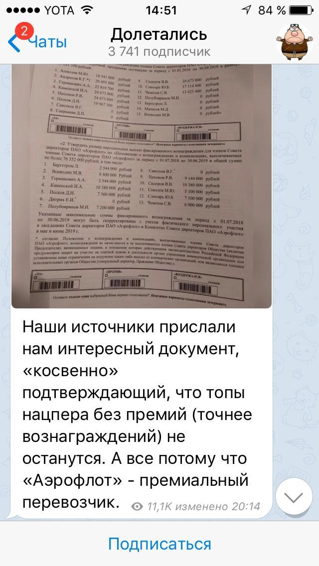 Документ, опубликованный в Телеграм-канале «Долетались», датирован 25 июня 2019 года. На официальном сайте «Аэрофлота» в пакете документов, подготовленных к годовому собранию акционеров, найти этот конкретный лист не удалось.