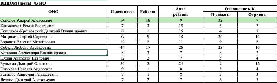 Из опрошенных ВЦИОМ жителей 43-го округа более половины (54%) ответили, что знают актера и режиссера Соколова, большинство положительно относятся к его профессиональной и общественной деятельности. У кандидата самый низкий антирейтинг – 9%. В тройку лидеров по известности на округе входят, кроме Соколова, кандидат от партии «Яблоко» Сергей Митрохин с антирейтингом в 24% и независимый кандидат Любовь Соболь (антирейтинг 23%).