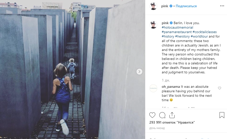 Певица Пинк (Алисия Бей Мур) столкнулась с острой критикой в Instagram после публикации фотографии отдыха своих детей в Берлине. На снимке изображены дочь поп-звезды Уиллоу и сын Джеймсон, играющие в догонялки на территории мемориала жертв Холокоста в центре города.