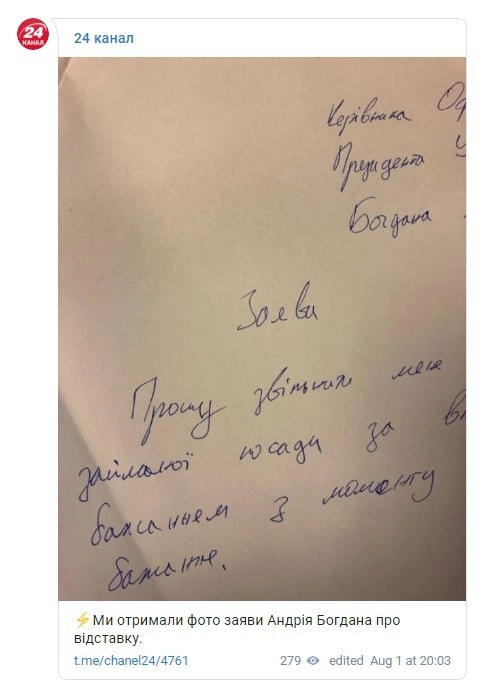 Ранее «24 канал» сообщил, что проработавший главой администрации президента чуть более двух месяцев Андрей Богдан подал заявление об отставке по собственному желанию.