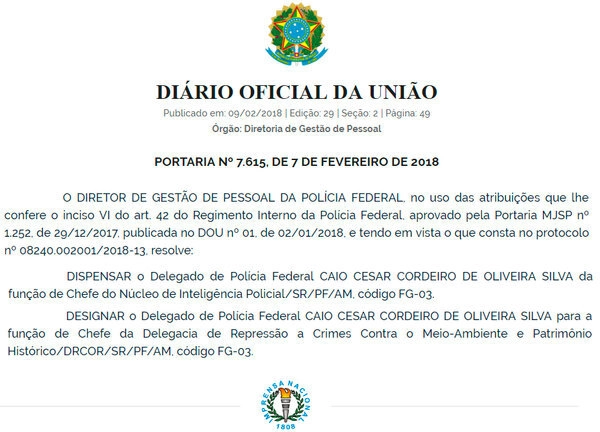 Приказ о назначении Кайо Кордейру начальником Отдела по охране окружающей среды