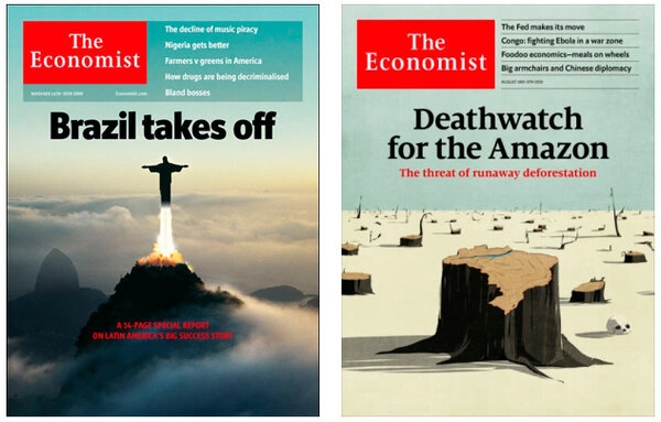 Эволюция обложек журнала «The economist» — от «Бразилия взлетает» в 2009 до «Последнего прощания с Амазонией» в 2019