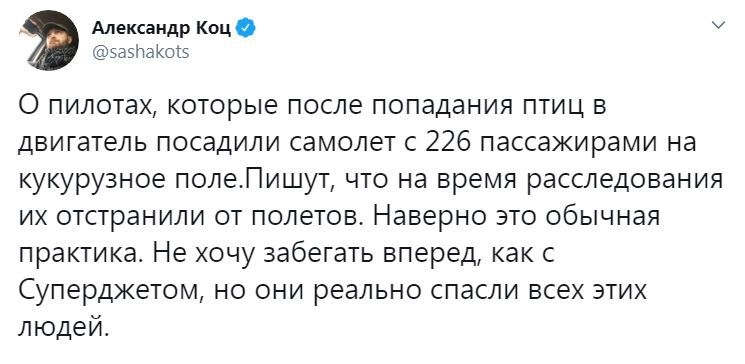 Мнение Куйвашева разделяют и сами спасенные от смерти пассажиры, а также пользователи соцсетей. Один из пассажиров эмоционально поблагодарил пилотов сразу после того, как выбрался из самолета на землю.