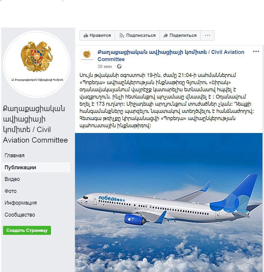 «Самолет авиакомпании „Победа“ при посадке в аэропорту Ширак в городе Гюмри повредил хвостовую часть, коснувшись взлетной полосы. На борту находились 173 пассажира. Жертв не было», — сообщается на странице Комитета по гражданской авиации Армении в Facebook.