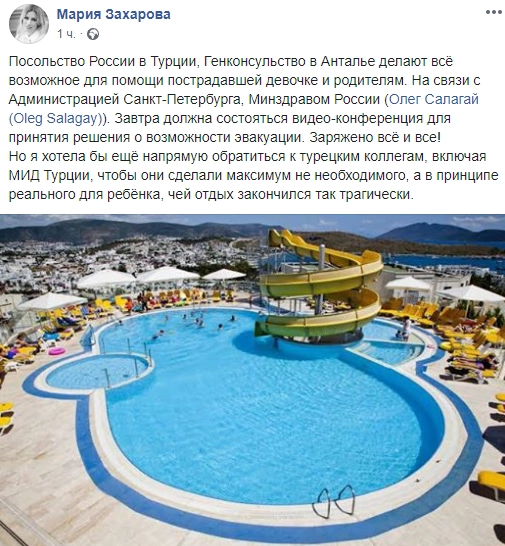 Завтра должна состояться видеоконференция для принятия решения о возможности эвакуации. Заряжено всё и все! Но я хотела бы еще напрямую обратиться к турецким коллегам, включая МИД Турции, чтобы они сделали максимум не необходимого, а в принципе реального для ребенка, чей отдых закончился так трагически, — написала Захарова на своей странице в Facebook.