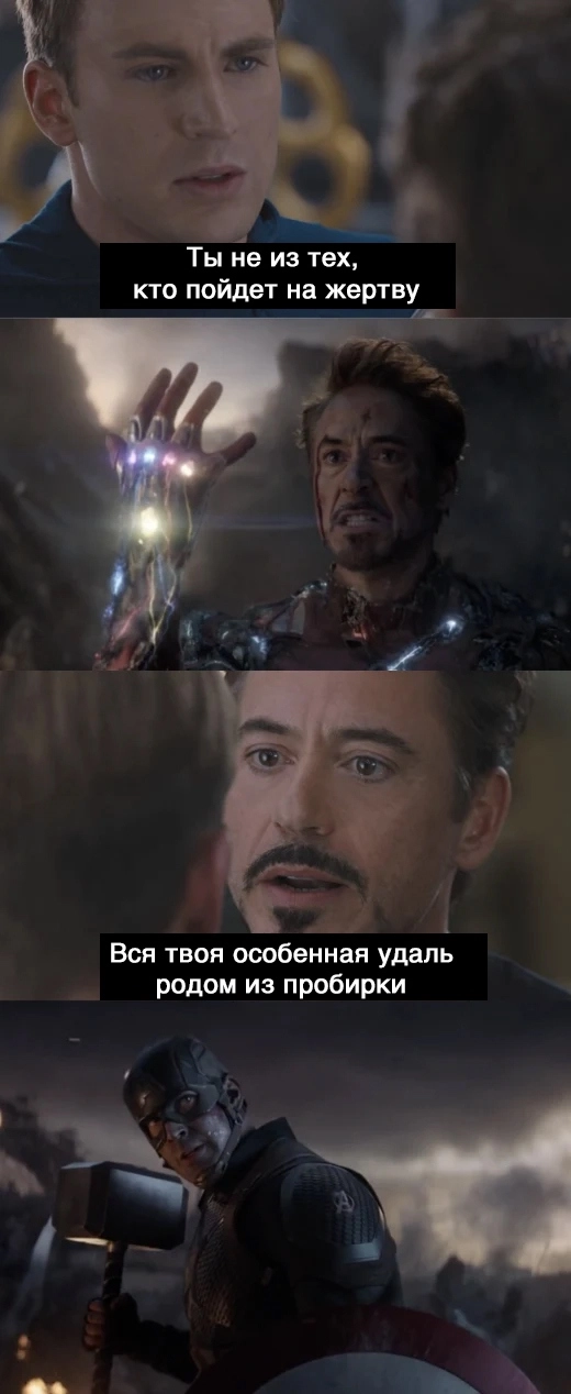 И наконец, в концовке фильма «Мстители. Финал» герои Стива и Тони доказывают, что они оба были неправы в этом диалоге