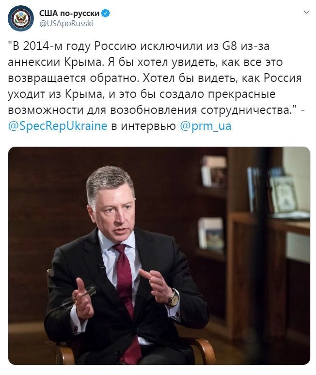 «В 2014 году Россию исключили из G8 из-за аннексии Крыма. Я бы хотел увидеть, как все это возвращается обратно. Хотел бы видеть, как Россия уходит из Крыма, и это бы создало прекрасные возможности для возобновления сотрудничества», — заявил Волкер в интервью украинскому телеканалу «Прямой».
