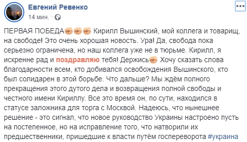 Тем временем российские журналисты в социальных сетях шлют поздравления вышедшему из тюрьмы коллеге.
