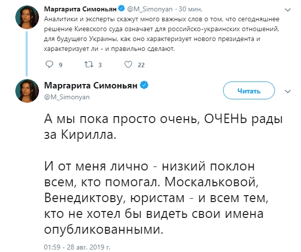 По данным российского РИА Новости, Вышинский ожидаемо оценил свое освобождение как «обоснованное и справедливое».