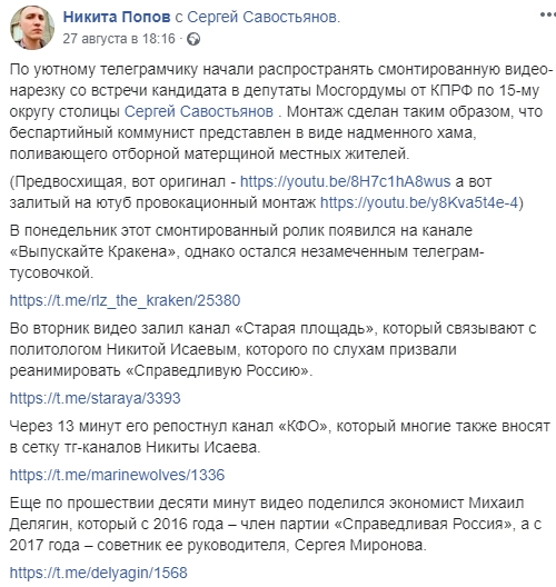 Сторонник КПРФ, политический обозреватель Никита Попов однозначно расценивает ролик-нарезку как черный пиар от кандидатов — соперников Савостьянова, утверждая, что первыми его принялись распространять Telegram-каналы, связанные с партией «Справедливая Россия».