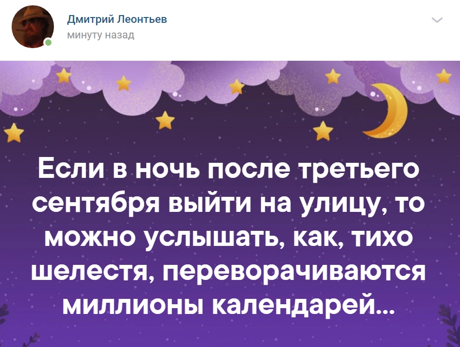 По его словам, люди часто рассказывают ему, что третье сентября — это какая-то знаковая дата для них — например, день рождения или день расставания с любимым человеком.