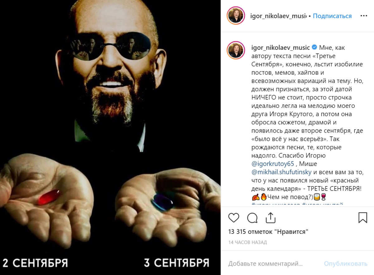 Между тем автор текста к песне Игорь Николаев выложил на своей странице в Instagram мем с Шуфутинским и также признался, что эта дата не несет в себе никакого смысла.