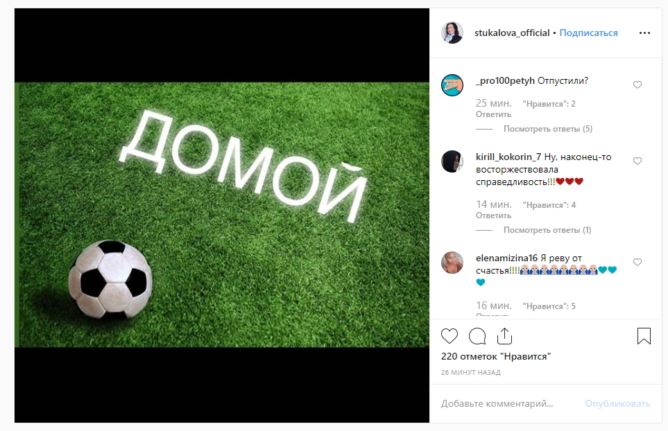 Об этом также сообщает и адвокат футболистов Татьяна Стукалова, опубликовавшая в Instagram фотографию футбольного мяча с подписью «Домой».