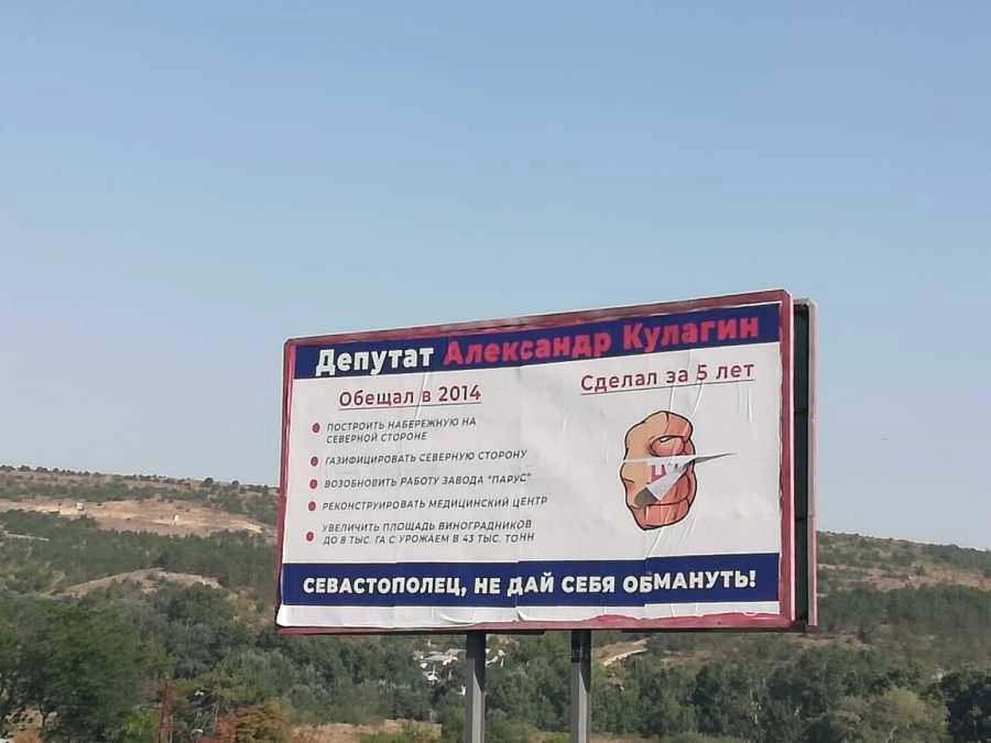 Билборды с надгробиями и кукишами появились в Севастополе 2 сентября. Помимо оскорблений на плакатах были также перечислены невыполненные обещания кандидатов, сторонников Чалого, данные ими на выборах в 2014 году.