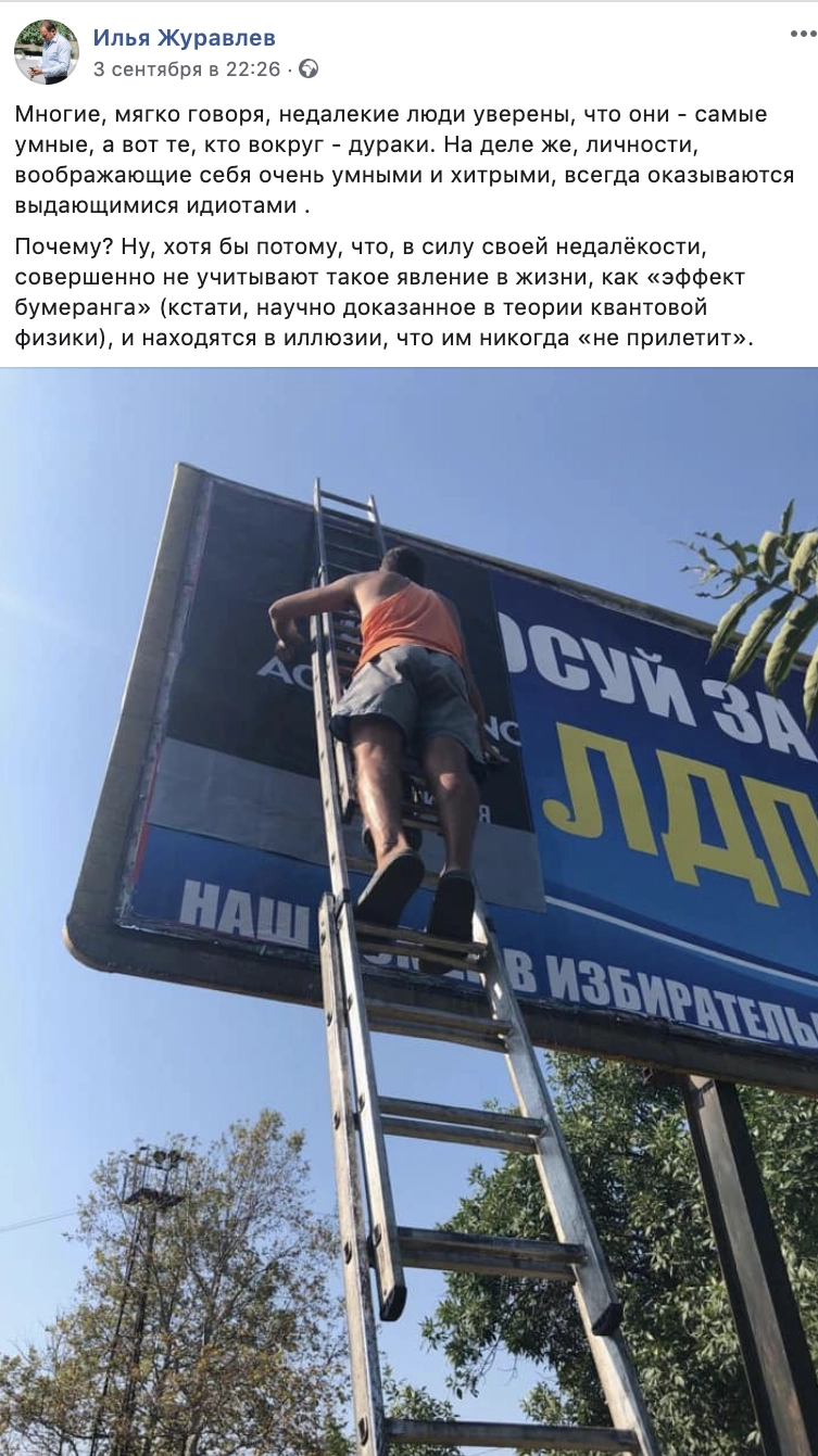 Глава севастопольского ЛДПР Илья Журавлев также пожаловался в соцсетях на то, что партийные плакаты заклеивают неизвестные. На своей странице в Facebook он опубликовал фотографии, на которых видно, как вместо предвыборной агитации ЛДПР появляется вывеска ночного клуба «Акваденс» (принадлежит теще господина Лебедева).