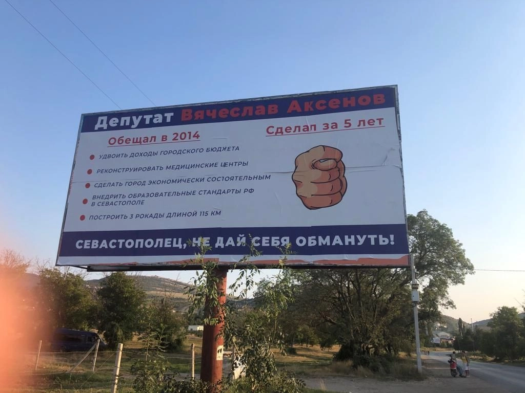 С середины весны к существующим незаконным билбордам с просроченными договорами постоянно добавлялись новые. И хотя местные власти регулярно сносили незаконные конструкции, на их месте или рядом рекламные щиты появлялись снова. Они буквально заполонили городские обочины ключевых транспортных артерий Севастополя. В некоторых местах сейчас можно увидеть по восемь бордов, стоящих в ряд, на которых рекламируют кандидатов в депутаты. Многие из них выглядят помятыми, словно долго лежали где-то на складе.