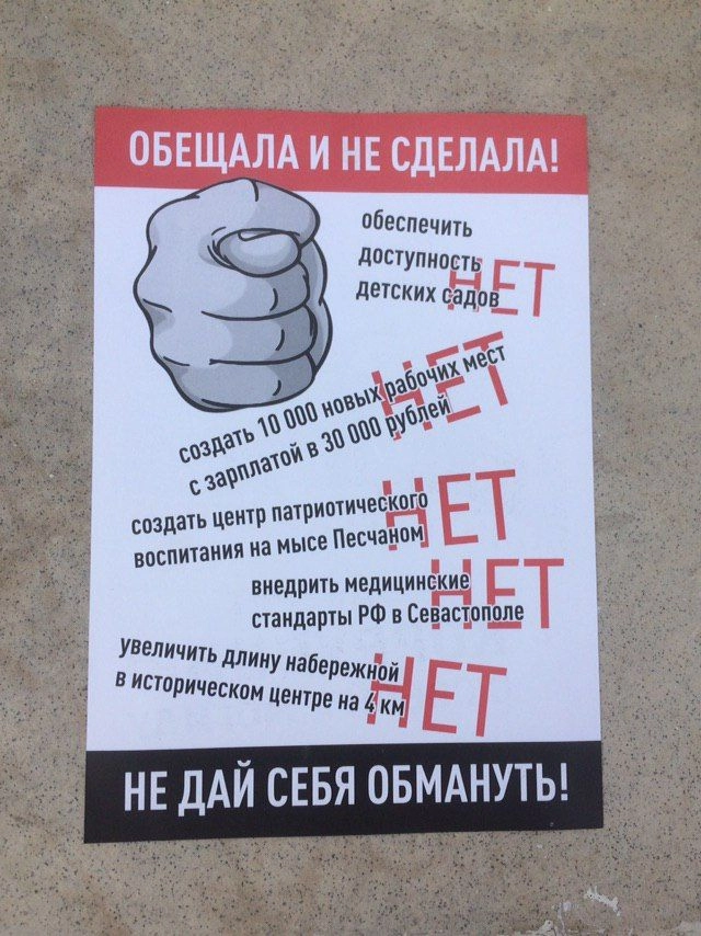 Агитацию депутата Вячеслава Горелова заклеили плакатом с большим кукишем и подписью: «Депутат Горелов. Севастополец, не дай себя обмануть!»