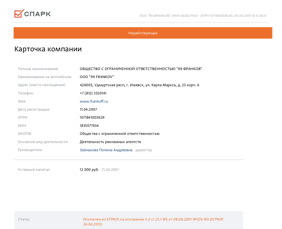 Интересно, что в системах проверки контрагентов типа «Спарк» те компании, что наши источники связывают с Павлом Лебедевым, не находятся от слова «совсем». Например, организаций под названием «99 франков» существует несколько, но две из них московские и точно ни при чем, а третья — и вовсе ликвидирована.
