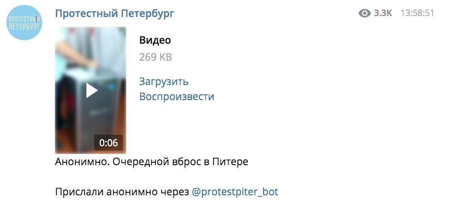 Одним из наиболее злостных распространителей фейковых нарушений годовалой давности является телеграм-канал «Протестный Петербург», аудитория которого превышает 10 тысяч человек. Авторы канала опубликовали видео, на котором неизвестный мужчина делает вброс бюллетеней в урну для голосований.