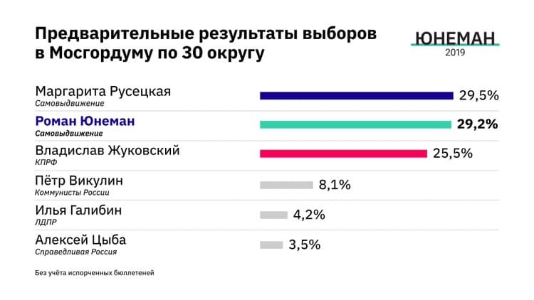 Но так ли это на самом деле? В 30-м избирательном округе на юге Москвы победу одержала самовыдвиженец Маргарита Русецкая, а не поддержанный «Умным голосованием» коммунист Владислав Жуковский. По итогу выборов кандидату от КПРФ досталась «бронза», а на втором месте оказался независимый кандидат Роман Юнеман. Для победы над Русецкой ему не хватило всего 84 голоса, которые он мог бы с легкостью получить, если бы «Умное голосование» не размыло голоса оппозиционно настроенных избирателей. В итоге — проект Навального помог победить члену «Единой России».
