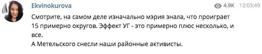 Он расколол оппозицию перед президентскими выборами, он расколол ее сейчас, перед выборами в Мосгордуму, в результате просто лишил шансов даже тех представителей оппозиции, которые могли бы побороться. В результате выборы стали очень предсказуемым, для тех, кто на эти выборы в результате не пошел, есть фамилия имя и отчество человека, которого надо за это «благодарить», — цитирует эксперта ТАСС.