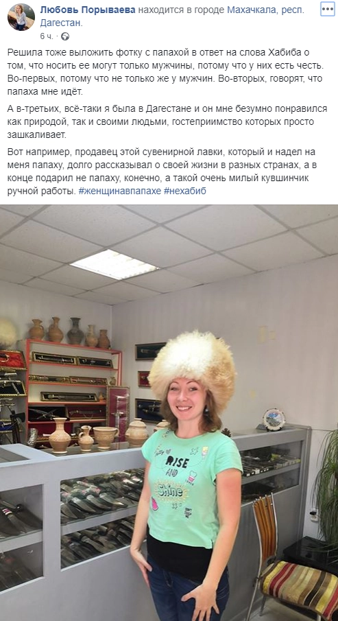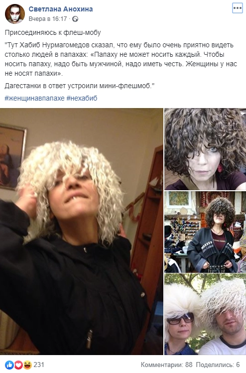 Россиянки сочли, что Нурмагомедов не считает, что у женщин может быть честь, и начали массово сниматься в папахах в знак протеста. Первыми фото в папахах опубликовали в Сети жительницы Махачкалы. Вскоре у кампании появились свои хэштеги — #нехабиб и #женщинавпапахе.