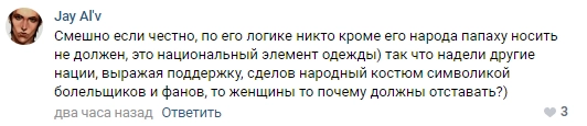Часть мужчин поддержала идею флэшмоба, сочтя комментарий Нурмагомедова неуместным. По их логике, раз традиционный мужской головной убор его народа надевают болельщики по всему миру, то запрещать папаху женщинам уже бессмысленно.