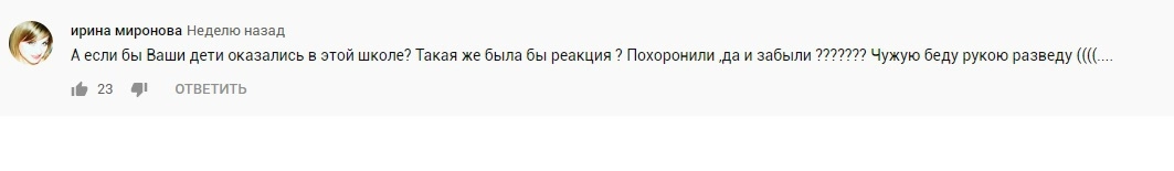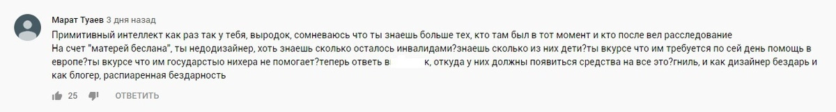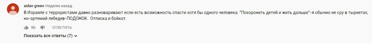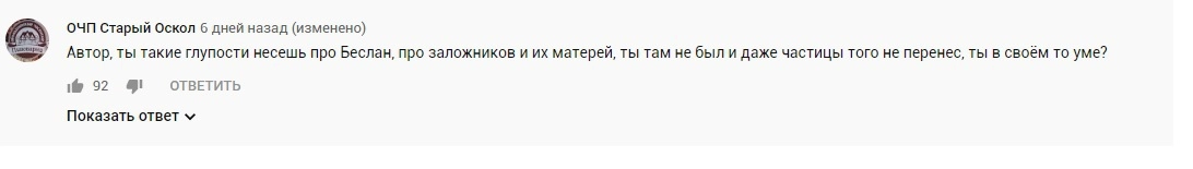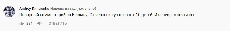 314 человек из числа заложников погибло. Из них 186 детей. Это ужасно страшная трагедия и ее нельзя забыть, но при этом не надо бегать, как бесконечно создающиеся и спекулирующие на трагедии комитеты. Все эти «Матери Беслана» или «Голоса Беслана» — они множатся, чтобы привлекать к себе внимание и получить как можно больше «политических пирогов». Вместо того, чтобы просто взять и похоронить своих детей. Она не могут повлиять на эту ситуацию никак. Надо жить дальше. Сейчас в нашей стране научились бороться с терроризмом и подобная история совершиться не может, — такими словами заканчивает ролик Артемий Лебедев.