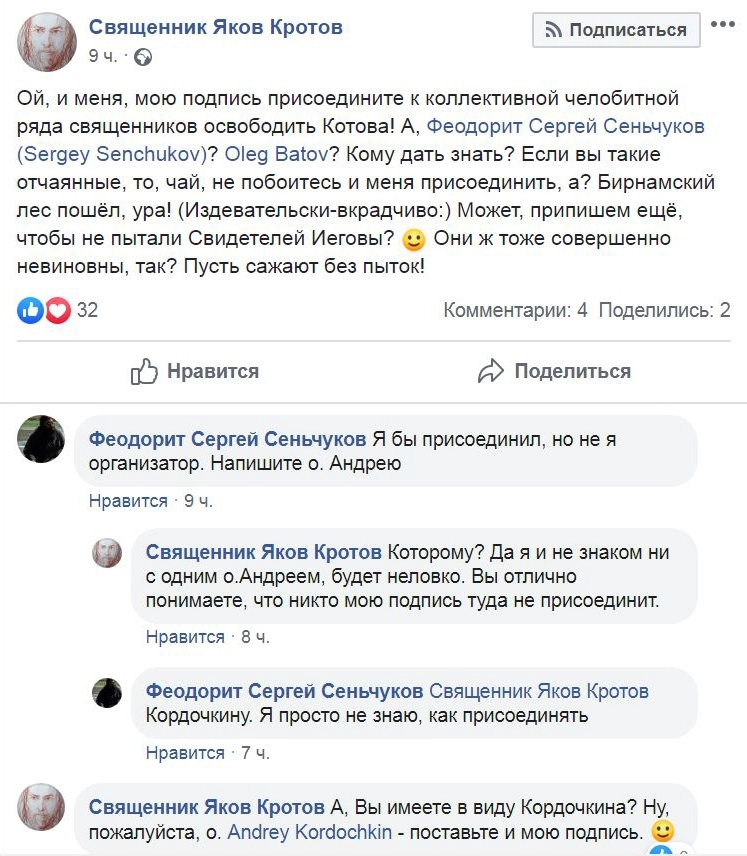 «Ой, и меня, мою подпись присоедините к коллективной челобитной ряда священников освободить Котова!», — написал Кротов в Facebook. Убедившись, что этого не произойдет, он скрыл свою запись.