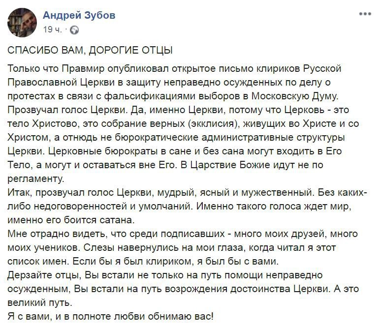 Ранее открытое письмо священников РПЦ в защиту осужденных по «московскому делу» прокомментировал диакон Андрей Кураев, назвав его «поступком с большой буквы». Также обращение священнослужителей горячо поддержал бывший профессор МГИМО Андрей Зубов, известный своими скандальными оценками событий Великой Отечественной войны, в частности, тем что назвал Гитлера «ангелом русской истории».