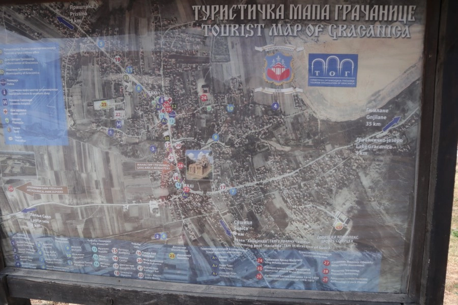 Скажем, дорожные указатели в Митровице — сербские, а в Грачанице — косовские. Вот типичные косовские указатели с сокращениями и с типичной сербской топонимикой (в албанских городах так улицы не назовут).