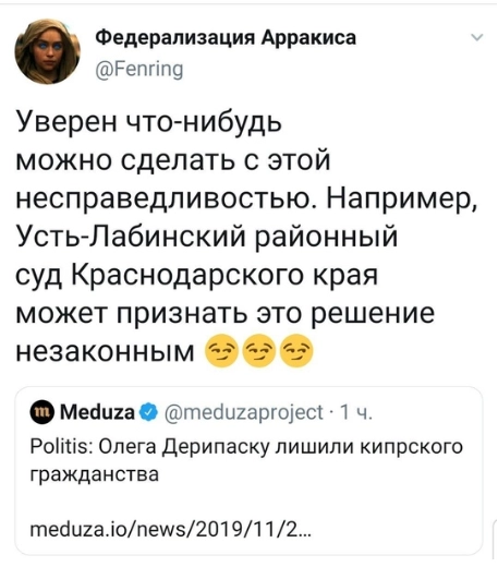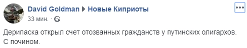 Пресс-секретарь президента России Дмитрий Песков заявил, что лишение олигарха «инвестиционного» гражданства, полученного им в 2017 году, не касается российского руководства. «Это касается Кипра и самого Дерипаски», — цитирует его ФАН.