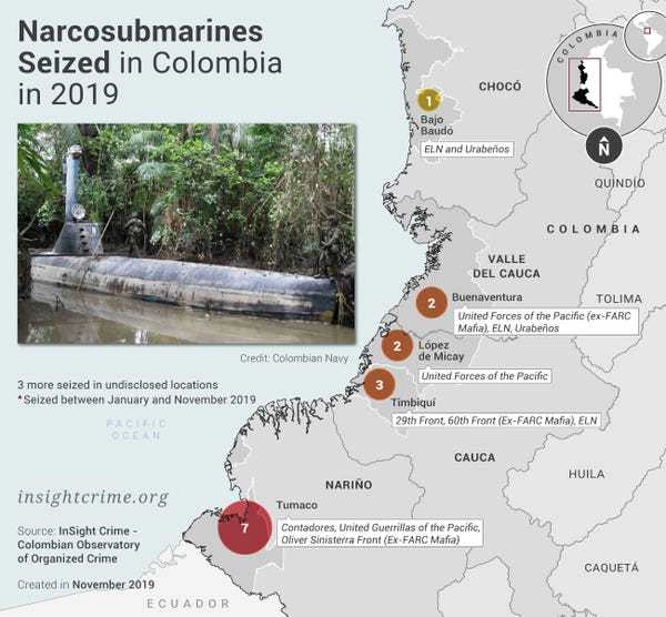 Изъятия подводных лодок в Колумбии также показали, что их использование стало практически обязательным для групп наркоторговцев, осуществляющих поставки за границу. Все найденные властями в 2019 году суда, находились либо в стадии строительства, либо использовались в отдаленных районах.