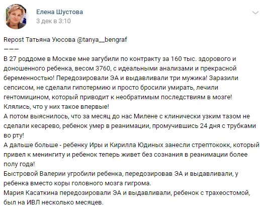 В адрес врачей роддома № 27 звучали и более серьезные обвинения — что они якобы «бросали умирать» пострадавших от своих ошибок новорожденных, отсылая их домой, чтобы не испортить статистику смертности в медучреждении.