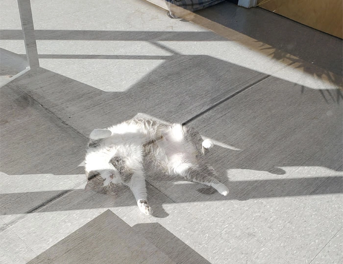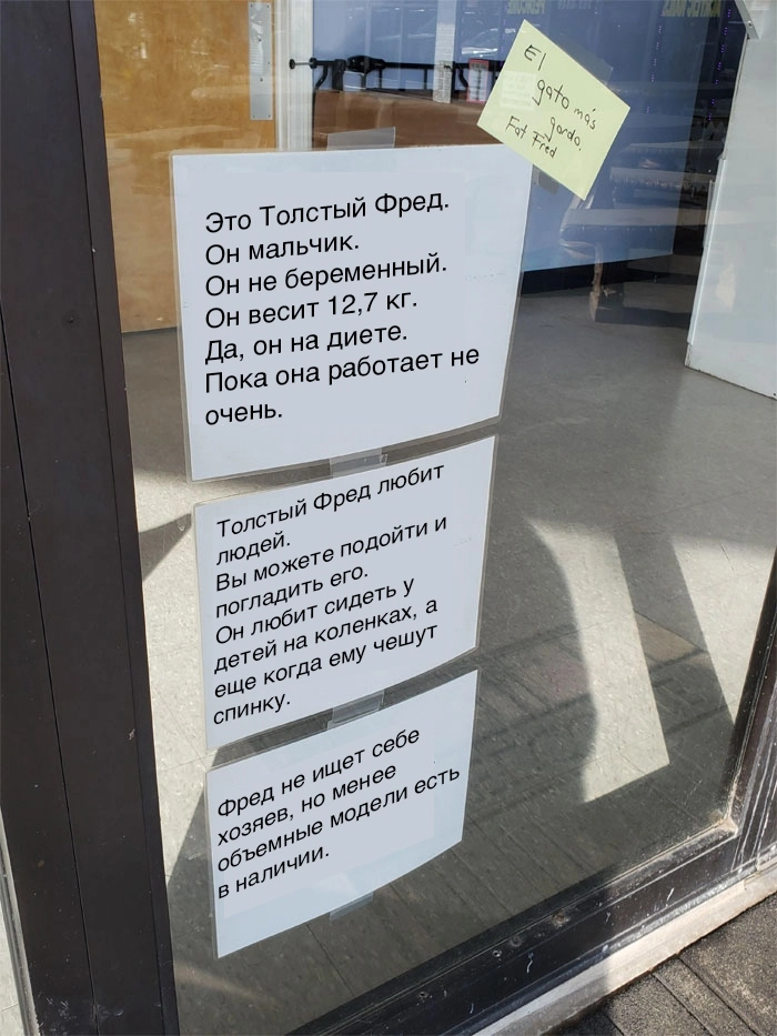 Это Толстый Фред — кот, ставший популярным в Сети после того, как кто-то опубликовал его снимок из ветклиники с забавным объявлением, висевшим рядом. Предназначение объявления — ответить на вопросы людей, которые впервые столкнутся с очаровательным котом, любящим прилечь у входа в учреждение.