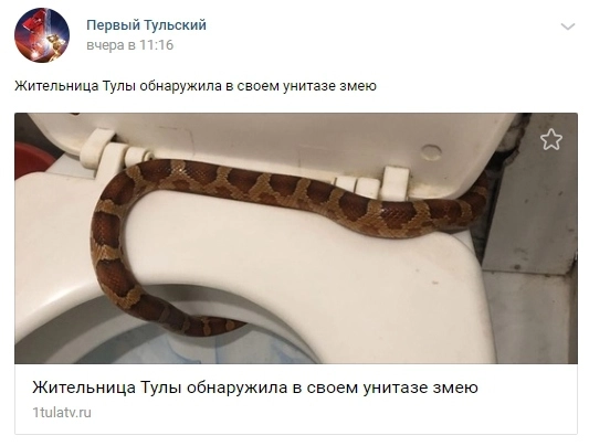 Жительница Тулы, вернувшись из отпуска, обнаружила в своем туалете змею, сообщает «Первый Тульский».