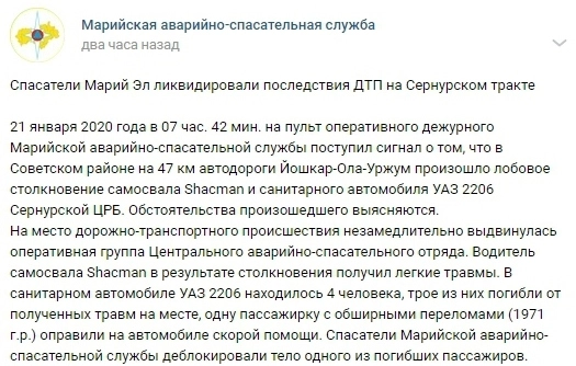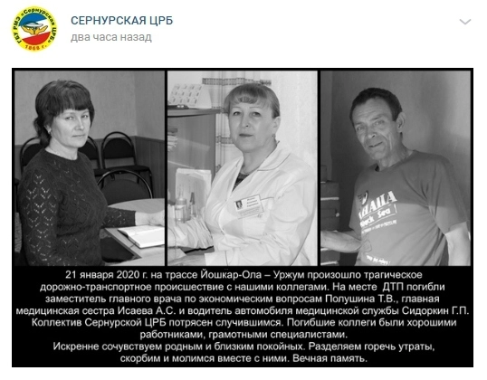 Как сообщили в Сернурской ЦРБ, авария унесла жизни заместителя главного врача, главной медсестры и водителя медицинской службы.