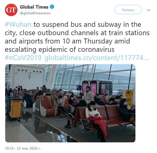 [Власти] Уханя приостановили работу автобусов и метро в городе, прекращается отправление с вокзалов и из аэропортов с 10 утра [5:00 МСК] четверга на фоне роста эпидемии коронавируса, — сообщается в Twitter издания.